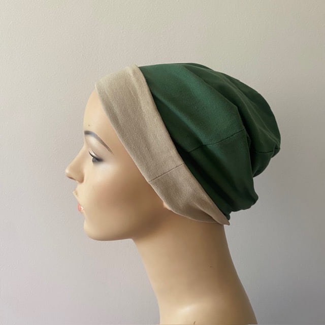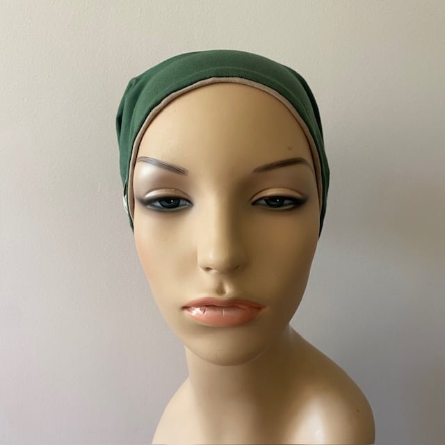 These hats are made from  Cotton Lycra. The hat is soft and has a low fit in the neck to hide the entire natural hairline. The hat is made from two layers of fabric and can be worn with either colour on the outside.